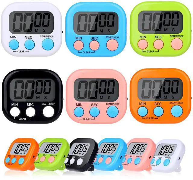 Multicolor Digital Kitchen Timer Set - Includes 12 durable kitchen timers for cooking (black, blue, green, orange, pink, white) 2 each color with magnetic backing and loud alarms. Perfect for organizing timers for classroom activities, kids routines, or simultaneous cooking tasks.