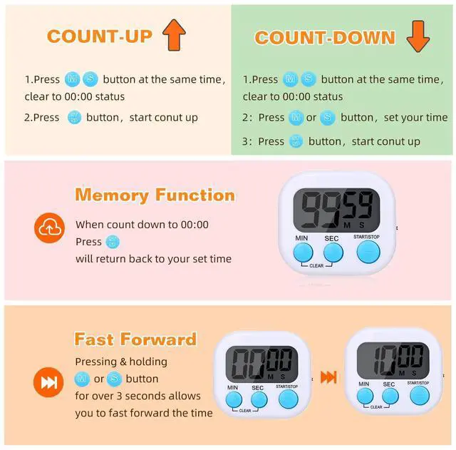 Counts Up and Down- kitchen timers for cooking is easy to operate, it can count down within the range of 1 second to 99 minutes 59 seconds, the minute and second buttons are set separately, Pressing & holding( M or S )button for over 3 seconds allows you to fast forward and save setup time, press and hold the ( M and S ) buttons at the same time to reset to zero and start over