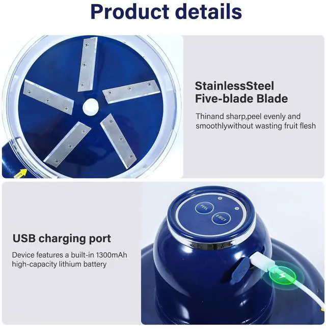 Convenient Wireless Design: This cordless peeler features a 1300mAh high-capacity battery and USB charging cable. On the countertop, at the table, or outdoors to enjoy freshly peeled fruit anytime