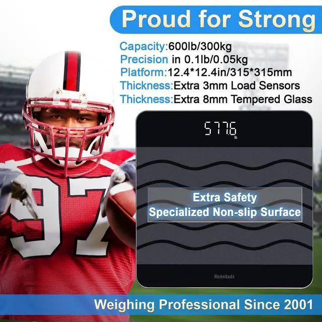 AMAZING CHOICE FOR DURABLE ACCURACY - Our-owned professional factory has been focusing on high quality scales SINCE 2001. We make the smart scale for body weight specialized for extra heavy weighing, and proudly guarantee amazing capacity 600lb / 300kg in 0.1lb / 0.05kg precision. On base of special 3mm thickness Load Sensors, 8mm thickness sturdy tempered glass, and Know-How Structure specialized for high weight capacity, the accuracy is quite credible even after durable heavy weighing.