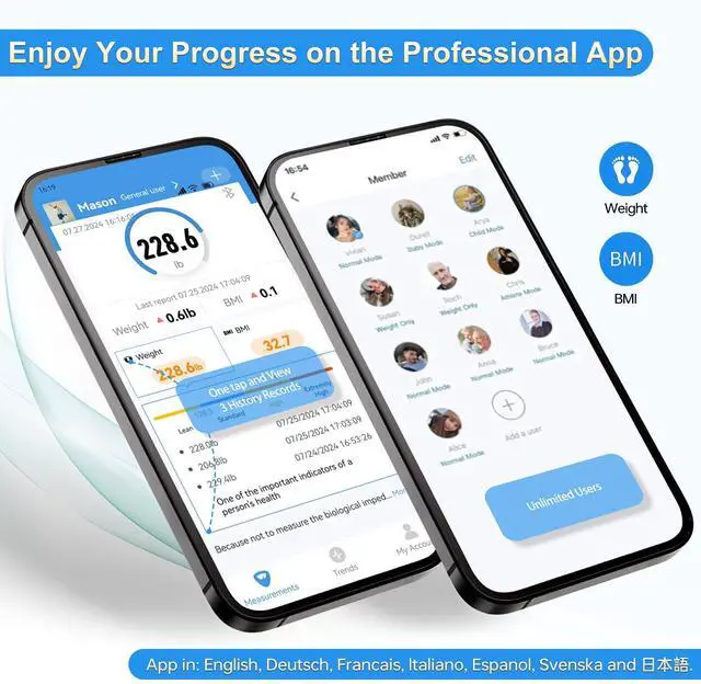 SERIOUS PRIVACY AND EASY SETUP - All user data of our professional App is secured and stored in US and EU Cloud Server via AWS Amazon Web Services). We protect your personal PRIVACY by best-in-class standard. What is more, Our app for smart bathroom scale is super convenient to create unlimited users for family and friends. And weighing numbers and BMI showed and stored in our ease-to-use APP through at-a-glance dashboard.