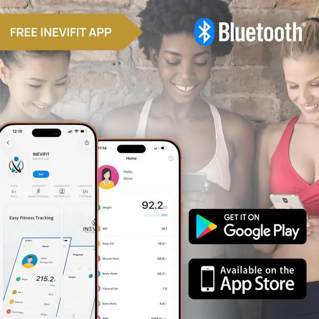 The Ideal Smart Fitness Body Composition Analyzer Scale Getting and staying fit has never been easier! INEVIFIT has made it convenient to monitor and track your body composition values by developing their all-new Bluetooth Body Analyzer Scale. Now you will be able to quickly get accurate body-fat %, visceral fat, muscle mass %, total body water %, bone mass, metabolic age, suggested basal metabolic caloric intake and even your body mass index, so that you know your body composition in seconds. This information is exactly what you need to reach your goals faster and stay motivated in the long run. The best part is that our fitness scale will keep your user profile stored so you only need to enter your information once and you will be automatically recognized for future uses. That means you will be able to focus on what matters and get that summer body you always wanted faster than ever! Keep your Body Fat and Water Percentages in Check Consistent gains in your fitness is literally a step away! As you work on your nutrition and exercises you will be able to check up daily & weekly on your body composition to make sure you are right on track. This will allow you to meet your fitness goals faster, be able to focus on burning unwanted fat, and live an overall healthier life. Taking control of your fitness is literally this simple! Elegant, Sleek & Efficient! Rejuvenate the look of your bathroom or bedroom by adding this beautiful piece of technology to your home. We have designed the modern yet elegant look of our body scale right here in Southern California, and have only used the finest materials to ensure you enjoy the premium quality experience. We have used a larger 3.6 LED display to allow for easy reading and upgraded the sensors to allow weighing users of up to 400lbs (180kgs). No more excuses, begin living a healthier life today!