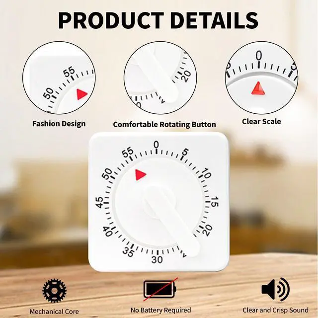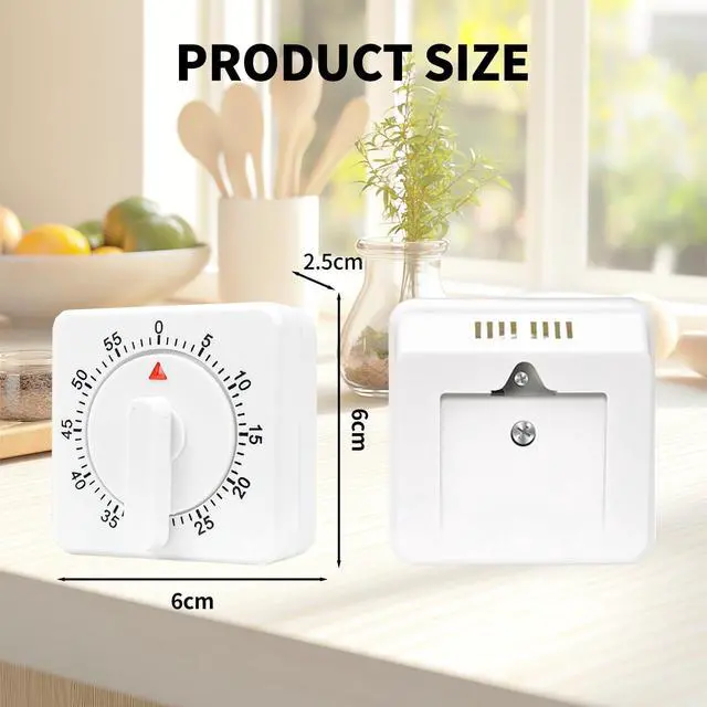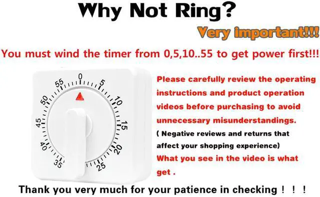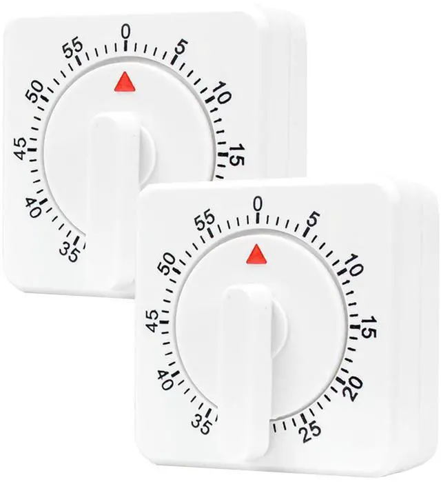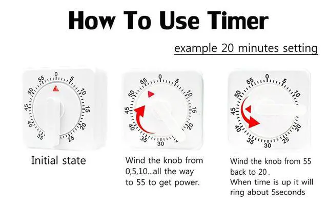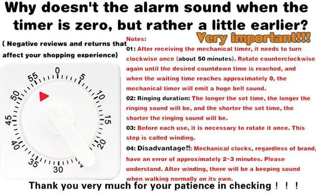 2 Pcs Kitchen Timer manual ,Mechanical Timer,60 Minute Visual Cooking Timer,Time Management Tools Hour Mini Countdown Mechanical Timer with Alarm for Kitchen,Cooking,Baking , Homework, Exercise Auto Off White Precautions and Instructions for UseNotes: 01: After receiving the mechanical timer, it needs to turn clockwise once (about 50 minutes). Rotate counterclockwise again until the desired countdown time is reached, and when the waiting time reaches approximately 0, the mechanical timer will emit a huge bell sound. 02: Ringing duration: The longer the set time, the longer the ringing sound will be, and the shorter the set time, the shorter the ringing sound will be. 03: Before each use, it is necessary to rotate it once. This step is called winding. 04: Disadvantage: Mechanical clocks, regardless of brand, have an error of approximately 2-3 minutes. Please understand. After winding, there will be a beeping sound when walking normally on its own.