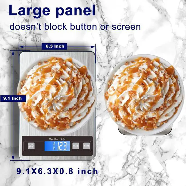 ** LARGE, WATERPROOF & EASY-CLEAN** "Experience the luxury of a full 9x 6.3 tempered glass platform. Its sleek, waterproof surface resists stains and wipes clean instantly. The smart design ensures the LCD display is never obscured, even with large bowls."