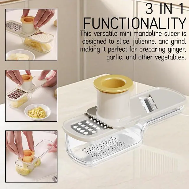 3 in 1 Functionality: This versatile mini mandoline slicer is designed to slice, julienne, and grind, making it perfect for preparing ginger, garlic, and other vegetables.