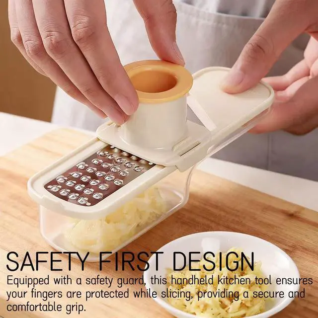 Safety First Design: Equipped with a safety guard, this handheld kitchen tool ensures your fingers are protected while slicing, providing a secure and comfortable grip.