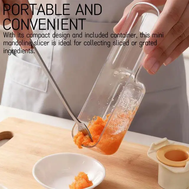 Portable and Convenient: With its compact design and included container, this mini mandoline slicer is ideal for collecting sliced or grated ingredients. It's ideal for both home kitchens and outdoor activities like camping and picnics.
