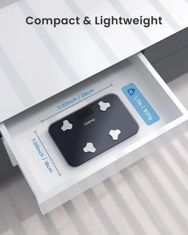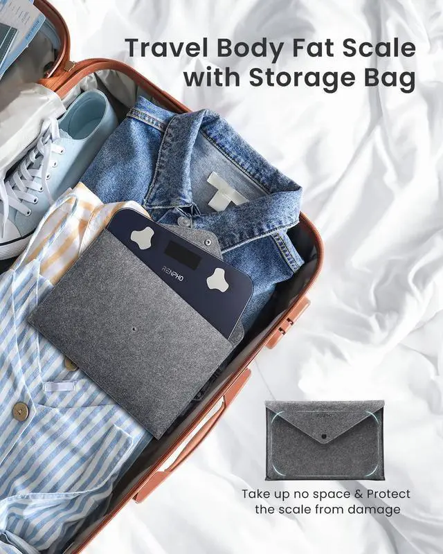 13 Essential Health Metrics: App-connected travel weight scale that measures body fat, BMI, muscle mass, water percentage, bone mass, and more. Perfect for fitness enthusiasts monitoring daily progress from the comfort of their bedroom or bathroom each morning