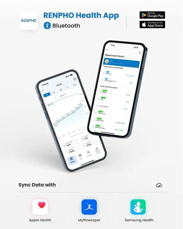 Connect to Fitness Apps: Small smart scale that connects with MyFitnessPal, Samsung Health, Apple Health, and Fitbit to centralize all your data bringing effortless tracking to your daily routine