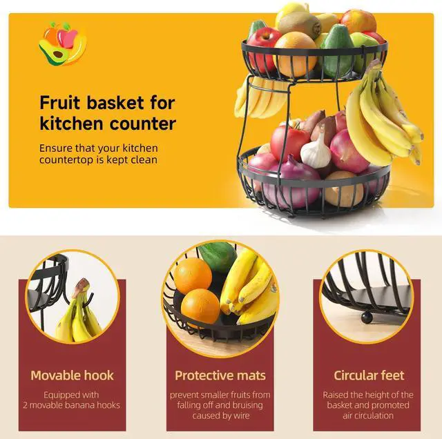 Our fruit basket includes two movable banana hooks to keep bananas fresh while being able to be hung in any position according to your preference.