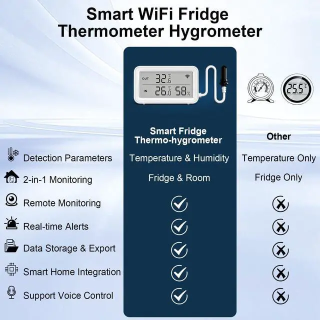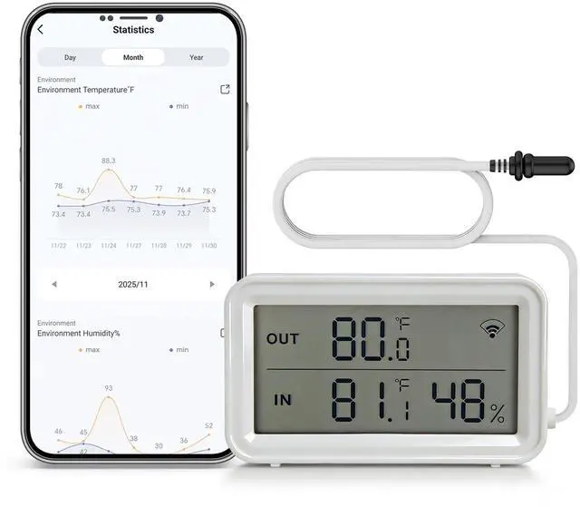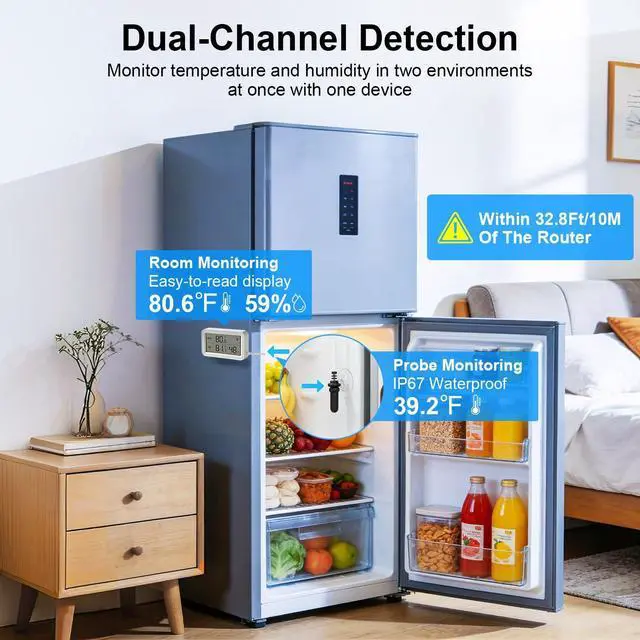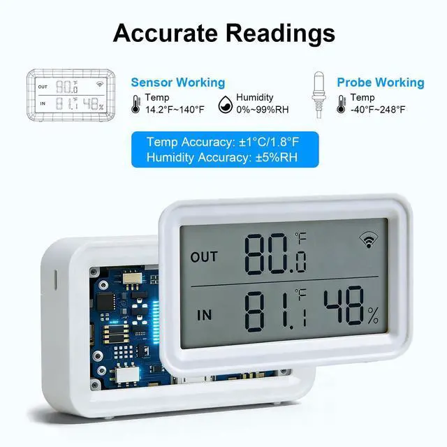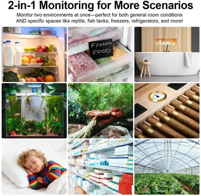 With built-in temperature sensor, you can detect indoor temperature, and with external temperature sensor probe, you can put in any places to detect the temperature like refrigerator, fish tank, incubator, storage tank, guitar case, reptile tank, etc.