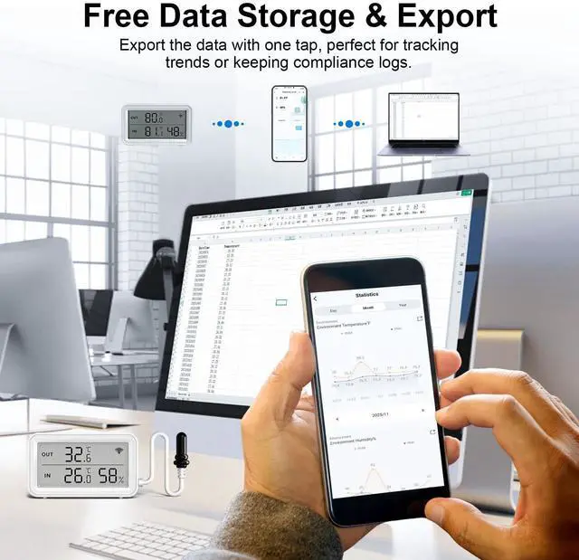 You can view statistics of temperature and humidity per Day / Month / Year, and export data to your email address.