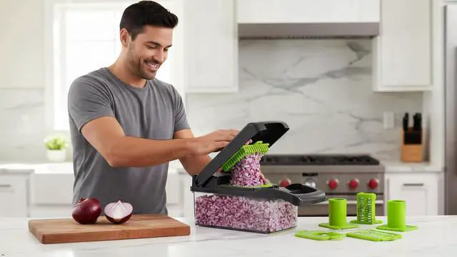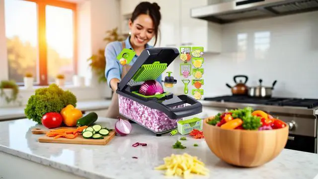 Introducing 14-in-1 Vegetable Chopper and Slicer, a must-have addition to your kitchen gadgets collection. Designed for both men and women who enjoy culinary endeavors, this multifunctional kitchen tool is ideal for those who appreciate the art of meal prep. Whether you're a seasoned chef or a cooking enthusiast, this versatile Manual food processor will enhance your kitchen experience kitchen gadgets clearance. This comprehensive kitchen gadget combines the functionalities of a hand-operated food processor, veggie chopper, cheese grater, and mandoline slicer, making it an indispensable asset for your culinary projects. The vegetables chopper comes with a secure container and lid, allowing you to neatly store chopped vegetables, fruits, and cheeses. This efficient food choppers with container helps you maintain an organized countertop, while ensuring your ingredients remain fresh and ready to use. The 14-in-1 design features various blades and accessories, including a potato dicer, cheese slicer, onion chopper dicer, and more. Its mandoline slicer for kitchen offers precision slicing for vegetables and fruits, enabling you to create consistent cuts with ease. From cutting veggies to dicing tomatoes, this vegetable chopper slicer is engineered for convenience and efficiency. For those who take their meal prep seriously, the vegetable slicer and chopper provides a range of functionalities, a grape cutter can be used to slice grapes with the appropriate blade, egg slicer for hard-boiled eggs, and an avocado slicer can be used to slice eggs and avocado with the appropriate blade. Its versatility extends to chopping onions, shredding carrots, and slicing cucumbers, making it a reliable companion for any meal preparation task. Crafted from durable materials, this kitchen chopper withstands daily use while delivering consistent performance. Its ergonomic design ensures a comfortable grip, minimizing fatigue during extended use. The compact size of the mini chopper manual food processor makes it easy to store when not in use, freeing up valuable kitchen space. This kitchen gadget not only serves as an onion cutter vegetable slicer chopper but also functions as a salad chopper, cheese cutter, and even a fruit slicer. The included onion container provides stability and safety, reducing the risk of accidental cuts. Furthermore, the vegetable cutter aids in cleaning your produce before chopping. Enhance your kitchen tools with this all-encompassing vegetable chopper and slicer, for those who enjoy preparing fresh and nutritious meals. Whether you're slicing tomatoes for a salad or dicing onions for a stew, this multifunctional vegetable chopper for kitchen is designed to meet your diverse culinary needs.
