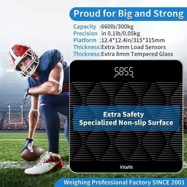 AMAZING DURABLE ACCURACY CHOICE - Our-owned professional factory has been focusing on high quality scales SINCE 2001. We make the smart scale for body weight specialized for extra heavy weighing, and proudly guarantee amazing capacity 660lb / 300kg in 0.1lb / 0.05kg precision. On base of extra 3mm thickness Load Sensors, extra 8mm thickness sturdy tempered glass, and Know-How Structure specialized for high weight capacity, the accuracy is quite credible even after durable heavy weighing.