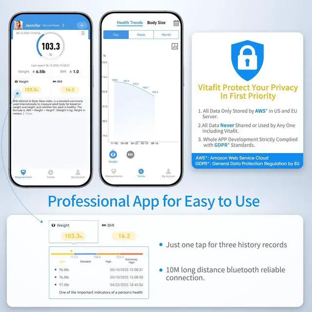 EASY SETUP AND SERIOUS PRIVACY - Our app for smart bathroom scale is super convenient to create unlimited users for family and friends. And weighing numbers and BMI showed and stored in our ease-to-use APP through at-a-glance dashboard. What is more, all user data of our professional App is secured and stored in US and EU Cloud Server via AWS Amazon Web Services). We protect your personal PRIVACY by best-in-class standard.