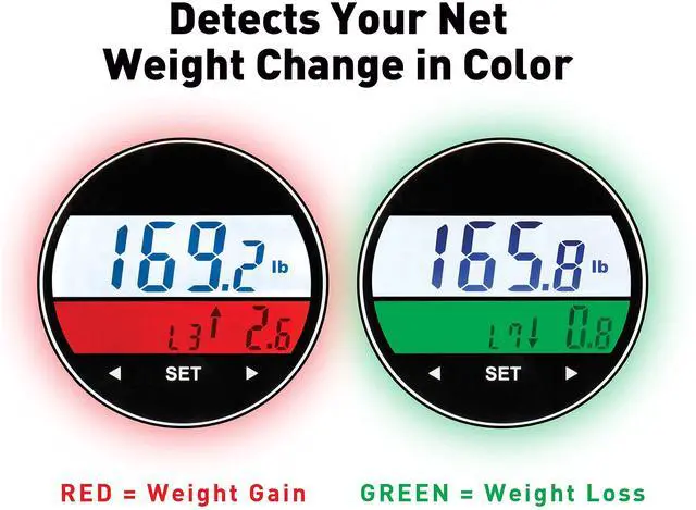 Smart LCD with Color Alert Technology -- For users who want to focus on their weight trend instead of the actual numbers, this scale displays your weight change in color, with a GREEN illumination for weight loss and RED for weight gain, providing a visual form of intuitive feedback.