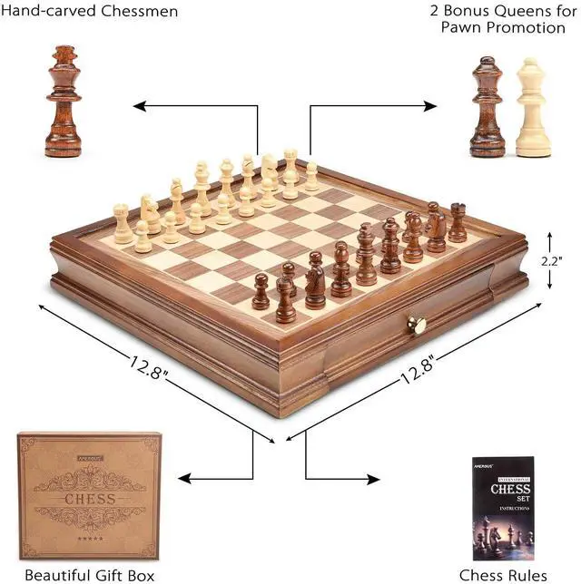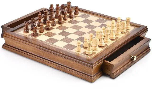The chess board set and the hand-carved pieces are made of high-quality wood and are therefore particularly durable.