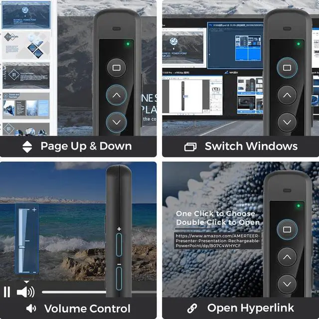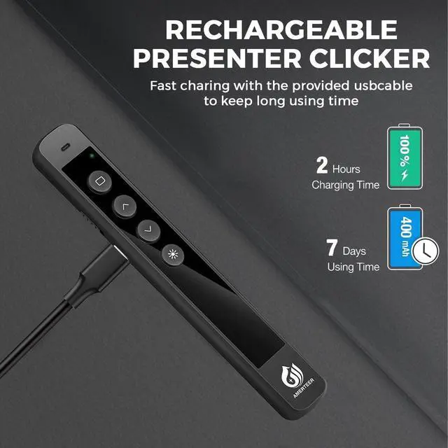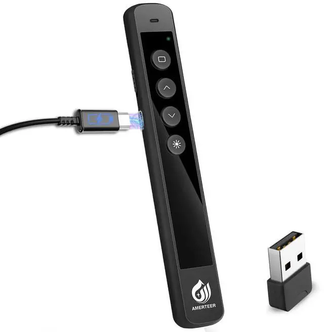 - AMERTEER rechargeable presentation remote with Full mirror glass surface round silicone buttons support the intensity of induction, accurate response, brings you comfortable touch feeling.