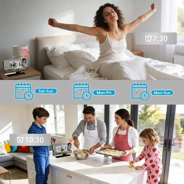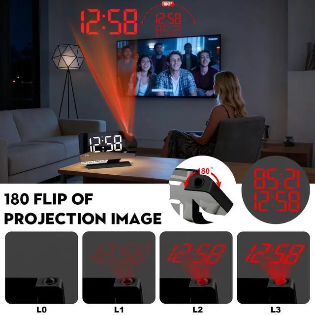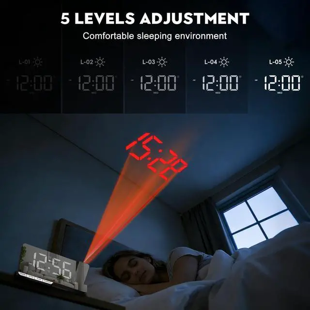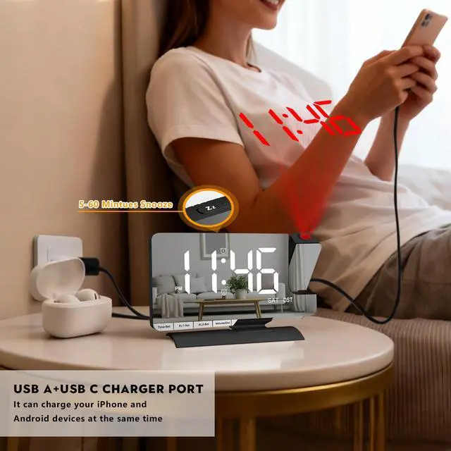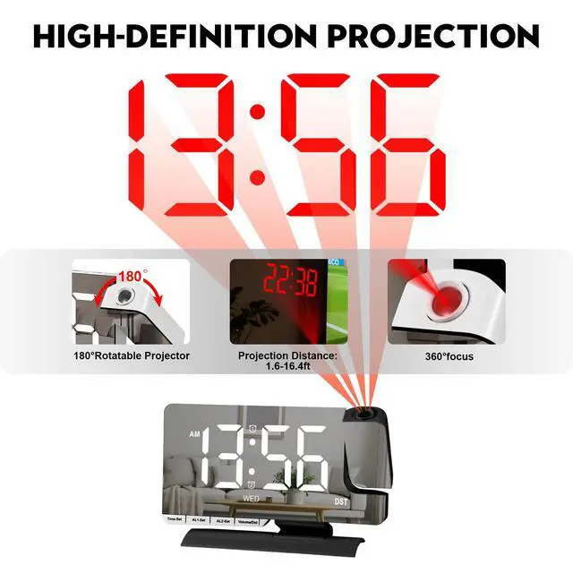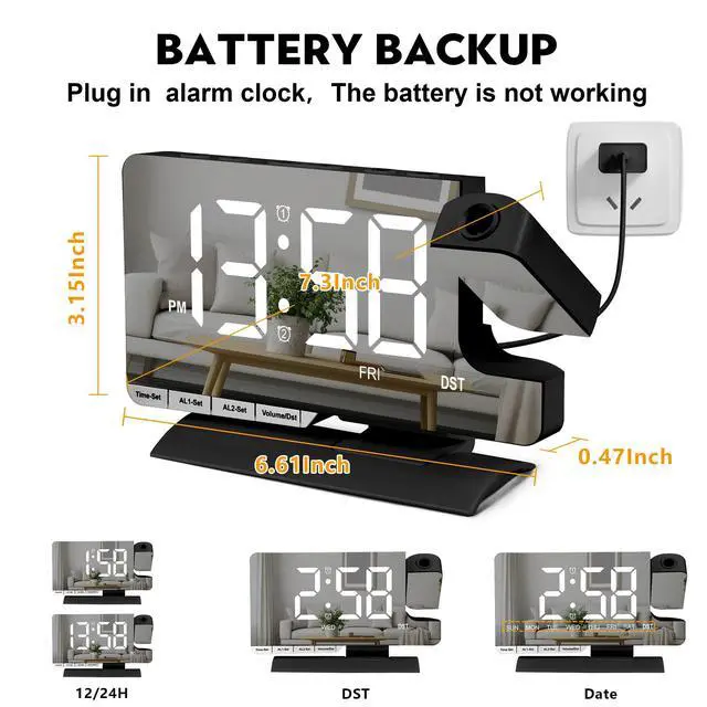 This Amgico digital alarm clock combines modern functionality with sleek design for your bedside table. Featuring a large 7.3-inch mirror display and 180-degree rotating projector, you can easily view the time on your ceiling or wall. The dual alarm system offers three different modes to suit your wake-up preferences, while the adjustable brightness ensures comfortable viewing day or night. With DST capability and convenient snooze function,this corded electric clock keeps you on schedule. The finish complements any bedroom decor, and the digital display provides clear, easy-to-read numbers. Perfect for bedrooms, kitchens, or any room where you need reliable timekeeping with projection convenience.