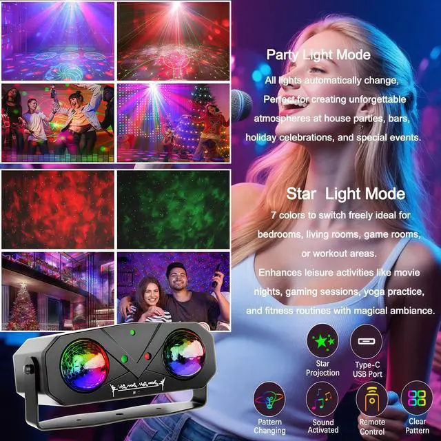 Our party lights are designed to be more exquisite, with added features such as starry sky projection and water pattern projection. The remote control is easier to use and comes with a 3-meter Type-C power cord and USB power plug. Let's use it anytime, anywhere, suitable for home indoor room decoration, outdoor party camping, and various party decorations, providing a more exciting atmosphere for your parties, festivals, birthdays, weddings, dances, cocktail parties, and stages!