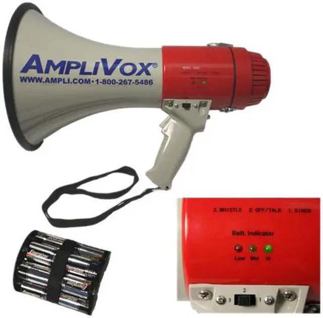 AmpliVox MityMeg S602 Megaphone - 25 W Amplifier - Built-in Amplifier - 40 Hour 25-watt megaphone features an LED charge status indicator to prevent unexpected battery depletion during use. Talk, Siren and Whistle modes deliver up to a one-mile sound coverage. Volume/gain knob gives you precise control over the sound. Pistol grip handle is angled for comfortable handling during prolonged periods. Battery-operated design requires eight C-size batteries (sold separately). Megaphone is perfect for use by event organizers, law enforcement, traffic control, marine environments and more.