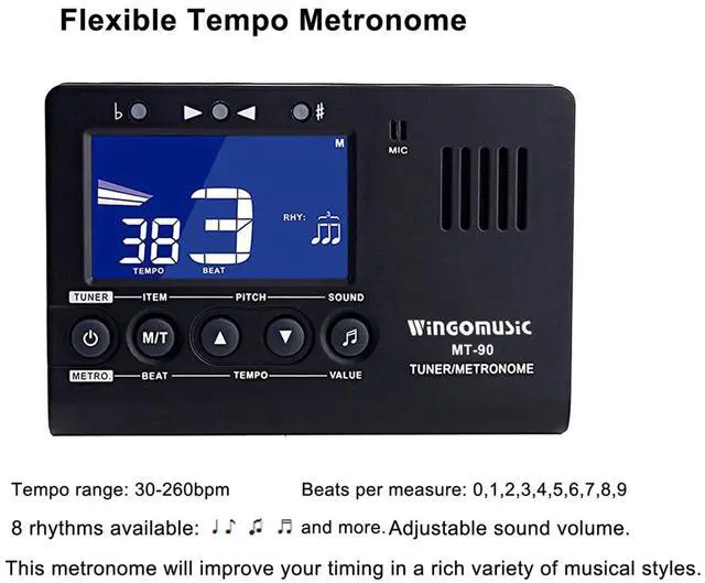 - 1.Under the tuner version, keep pressing “M/T” button till appears the numbers for "tempo"beat" on the sereen .Now,it's in the Metronome version.