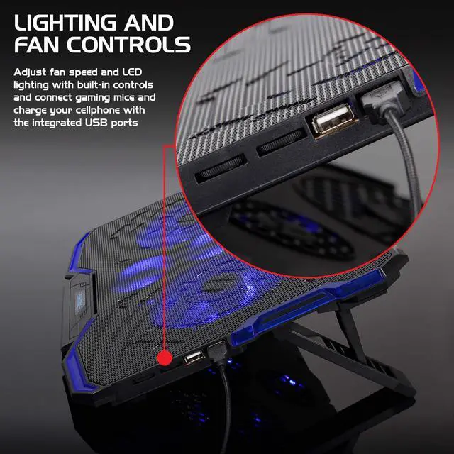 | Features | 5 Fans, Removable Laptop Bumper, 7 Height Settings | 5 Fans, Laptop Bumpers, 3 Height Settings | 1 Fan, Removable Bumper Plate, 7 Height Settings | Clamp Design, Drink Holder, Accessory Storage | 4 2.0 USB Port, Cable Management, Vibrant LED's |