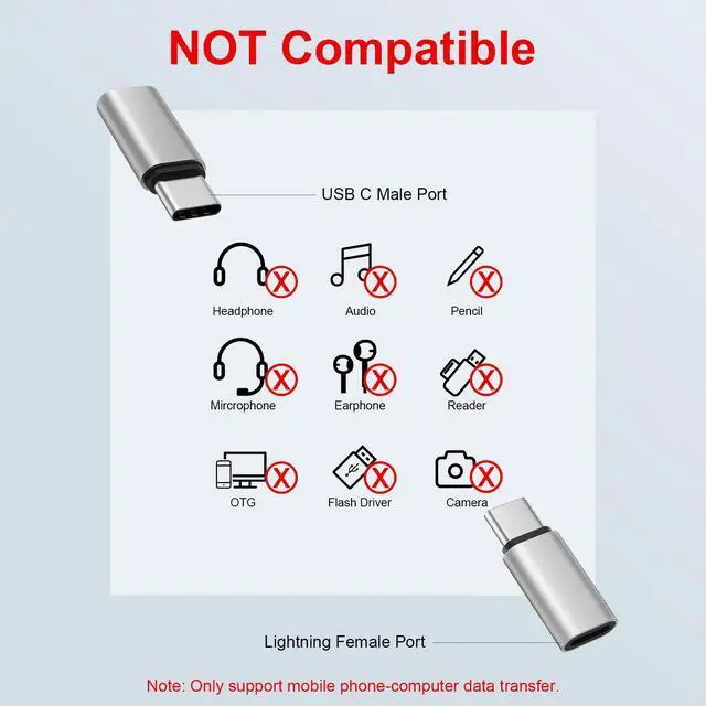 2.NOT compatible with audio. NOT support OTG video and audio functions. Charging and data transfer ONLY. 3.NOT support headphone cable. Only for smartphone-computer data transfer.