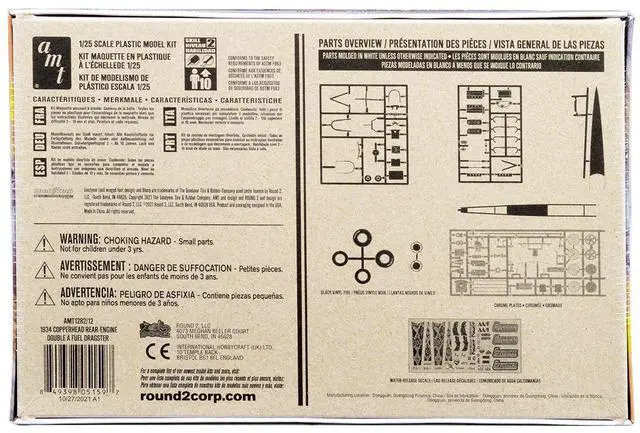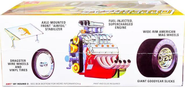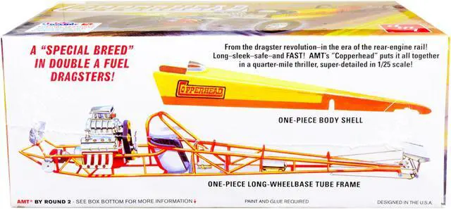 Brand new 1/25 scale plastic model kit of 1934 Copperhead Rear-Engine Double A Fuel Dragster (Skill 2) 1/25 plastic model kit by AMT.