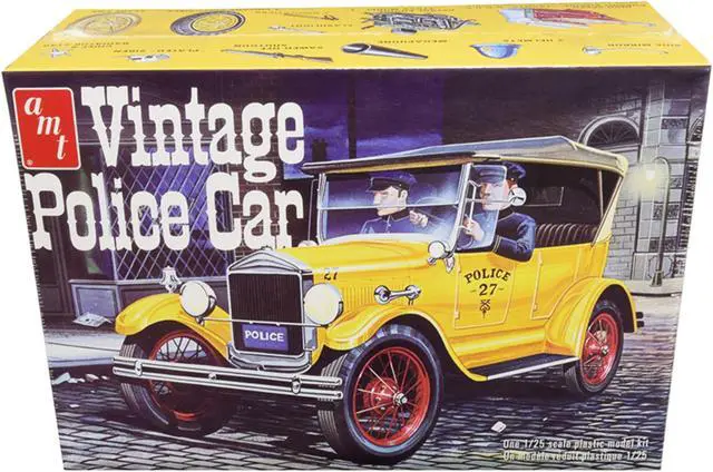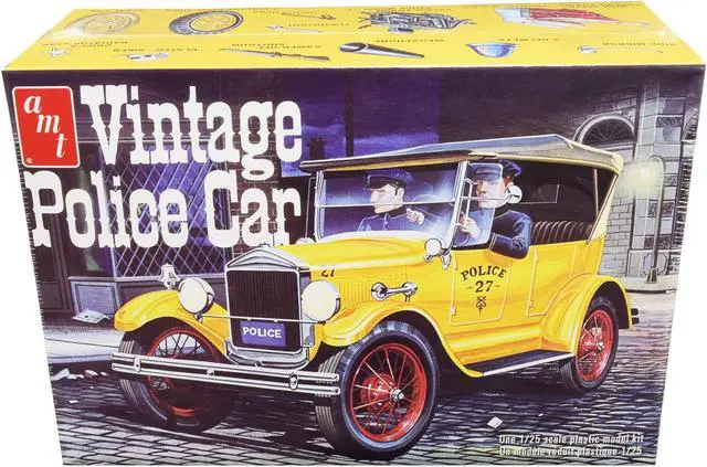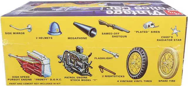 This vintage police car features details and optional parts such as side curtains and stock and high speed pursuit engines. Classic crime-fighting equipment such as old-timey helmets, megaphone and night sticks are included.