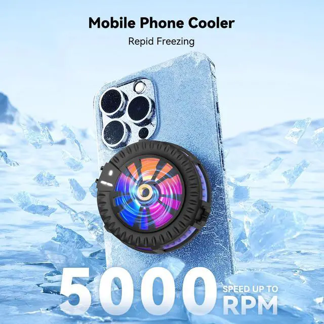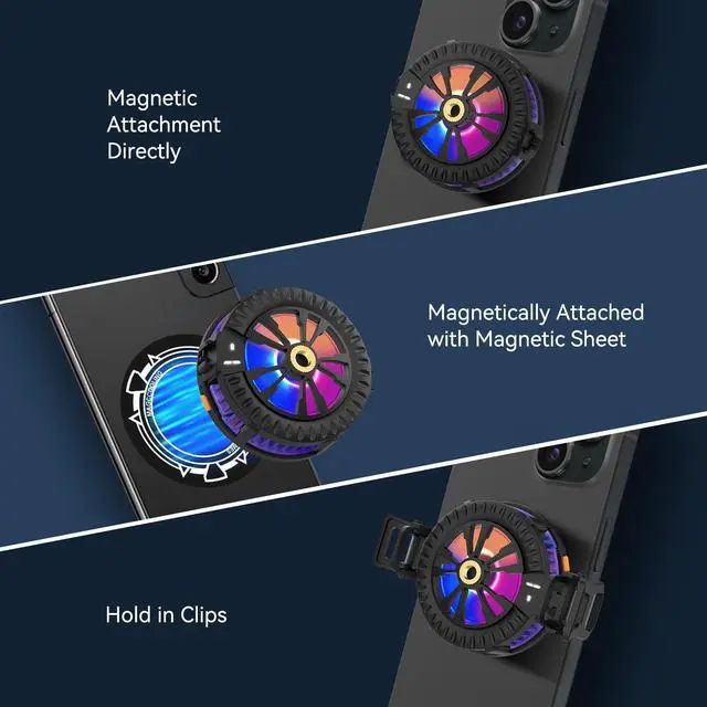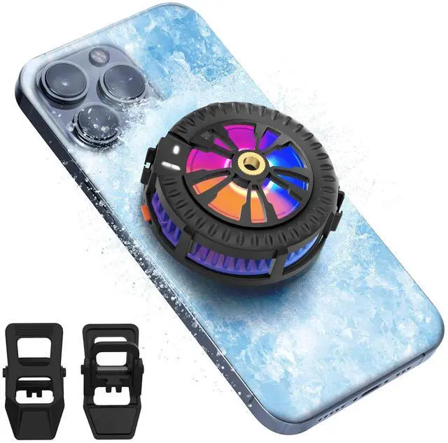 Powerful Cooling PerformanceThe phone cooler adopts TEC cooling chip, semiconductor graphene cooling fin and engineering heat dissipation channel design, which realizes repid freezing, and reaches the low temperature directly in a few seconds after power on. This cell phone cooler comes with a three-level adjustment function. You can adjust the power level according to your actual needs by pressing the button on cell phone fan Magnetic Backet Type RadiatorThis magnetic phone cooler features a magnetic adsorption design. You can directly attach the phone fan to the heat-generating area using magnetic force for iPhone 12~15 series/iPads/tablets etc. We included a free magnetic sheet for non-magnetic suction phone or attach the two detachable clips provided to the fan for phone. Additionally, the copper nut design allows it to secure the device Comfortable Gaming ExperienceThe magnetic cell phone cooler introduces 360 degrees no shelter design, part of the product shell material up and down block the ventilation, directing hot air away from your hands. Weighing just 93g lightweight, effortlessly fits into your on-the-go lifestyle, providing convenient cooling wherever you venture. 3 color light effects bring you a better game experience Ultra-Quiet Run on Mute The direction of the heat sink exhaust has been taken into account in terms of fan noise. This design makes our radiators very quiet, allows you to comfortably watch games and videos and is also recommended at the time of the voice chat and live broadcast. Digital display panel, more intuitive display machine temperature and cooling effect Premium Quality CraftsmanshipThe wire is made of 11 pure copper power lines, which strictly ensure the current and power, and it is not easy to break after repeated bending, so our radiator has a longer life. The product requires a wired connection (Type C) to function, and the rated input is 5V 2A. Please use the correct device for power supply, otherwise the product will be damaged
