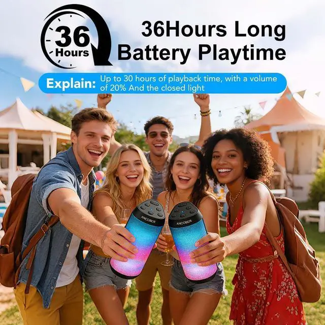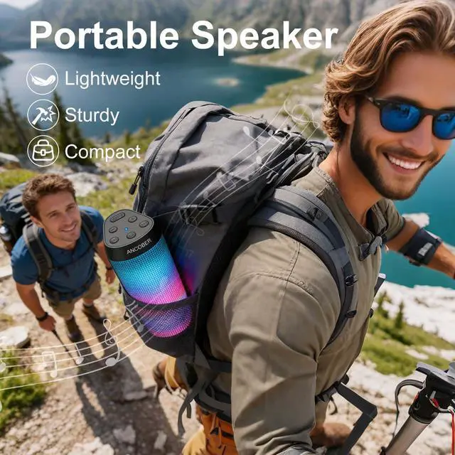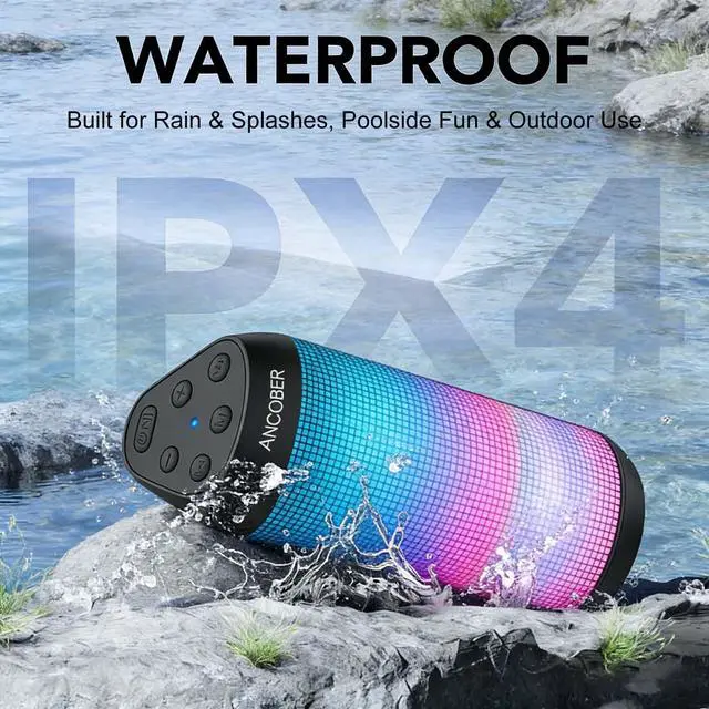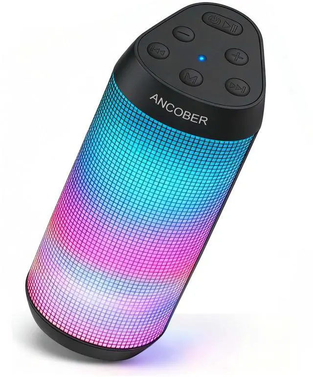 ANCOBER Portable Bluetooth Speaker delivers high-definition powerful stereo hifi sound that fills any space with rich audio. Its fashionable exterior design and 8 cool light modes complements any setting. It brings your music to life and you can enjoy a blend of style, performance, and durability.