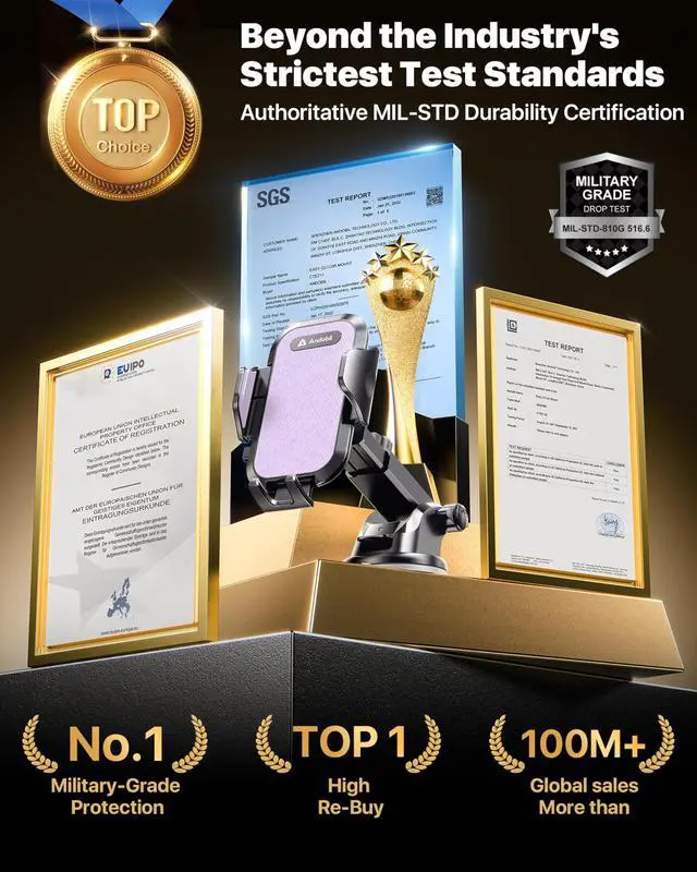 Industry NO.1 Military-Grade StabilityAuthorized by the international Military Standard with 50+ rigorous engineering tests of 89 lbs suction, 44°F --195°F temperature test, 10,000+ Opening and Closing tests, etc., its stability, security and durability perform NO.1 among all holder. By especially breaking the industry's record obtained international military-grade shockproof certification No. GZMR220601855501, Hold your phone firmly on any rough roads.