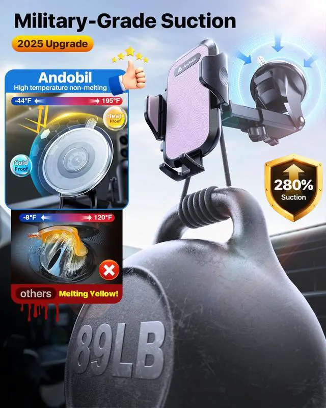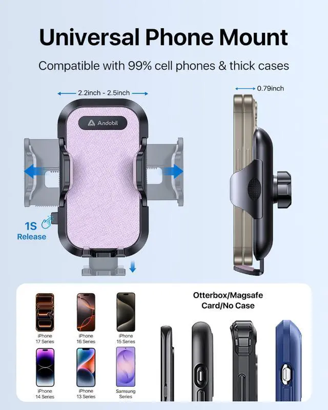Andobil 3-in-1 Universal Car Mount Your Trusted Driving Companion Join over 90 million satisfied users who trust Andobil for premium quality and innovative design. Our car mount features advanced nano gel suction cups and robust steel core vent clips, ensuring a secure hold on dashboards, windshields, and air vents. Perfectly compatible with various vehicle types, including trucks, SUVs, and cars.