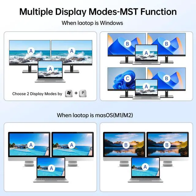 - [USB C KVM with MST ]Extended mode:extended mode can output three different screens,mirrored mode can output three identical screens.NOTE: Mac M1,M2 doesnt support MST (multi-stream transport), so the screens that extends to 2 external monitors are the same.