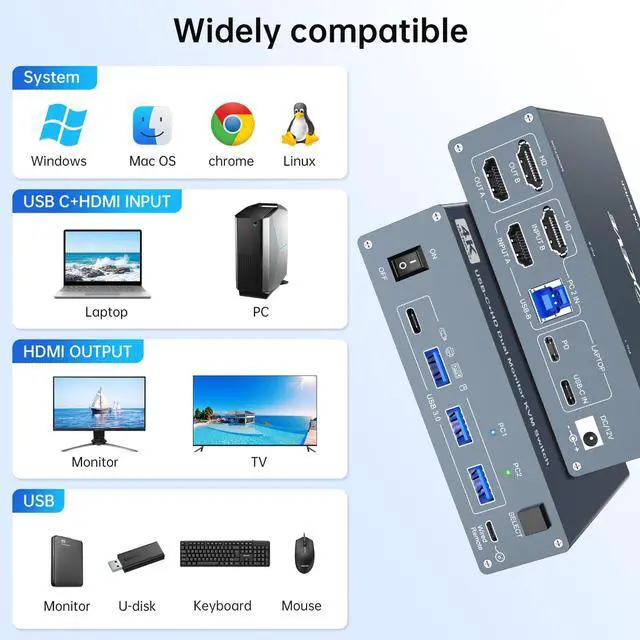- [Broad Compatibility]2 PC 2 monitor USB C KVM switch Plug and play,drive-free.USB-C 2 monitors KVM switch can be compatible with many operating systems,such as Windows 7/10/8/8.1/7/Vista,Linux and Chrome OS.It is widely applied for home,office,teaching,games,etc