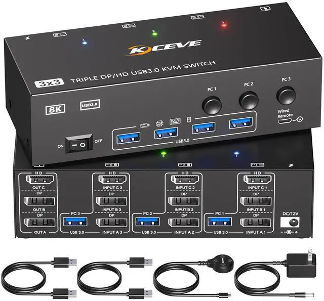 HDMI+2Displayport KVM Switch 3 Monitors 3 Computers 8K@60Hz 4K@144Hz,Triple Monitor KVM Switches with 4 USB 3.0Port for USB Devices,Wired Remote,Power Adapter and USB Cables Included.