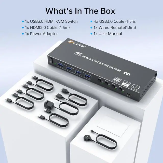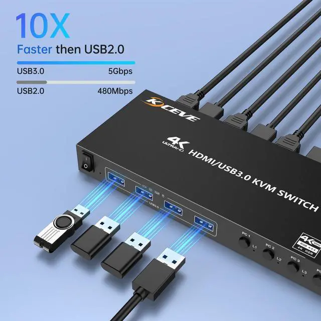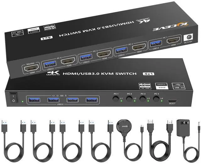 HDMI KVM Switch 4 Computers 1 Monitors 4K@60Hz 2K@120Hz,4 Port KVM Switch with Simulation EDID for 4 PCs Sharing Monitor Keyboard Mouse Hard Drives Printer Wired Remote,Power Adapter Included The 4-port HDMI KVM switch supports 4 computers sharing 1 monitor,1 set of keyboard and mouse,and 4 USB 3.0 peripherals (5Gbps transmission),saving space and flexibly switching to enhance efficiency; HDMI KVM switcher 4 Port supports 4K@60Hz ultra-high definition (compatible with 2K/1080P..etc), comes with an HDMI cable; quick switching via panel buttons/controller,with LED real-time display control;4K HDMI KVM is compatible with mainstream systems such as Windows/MacOS,with power supply ensuring stable operation,Our KVM offers 12 months of free replacement after-sales service.