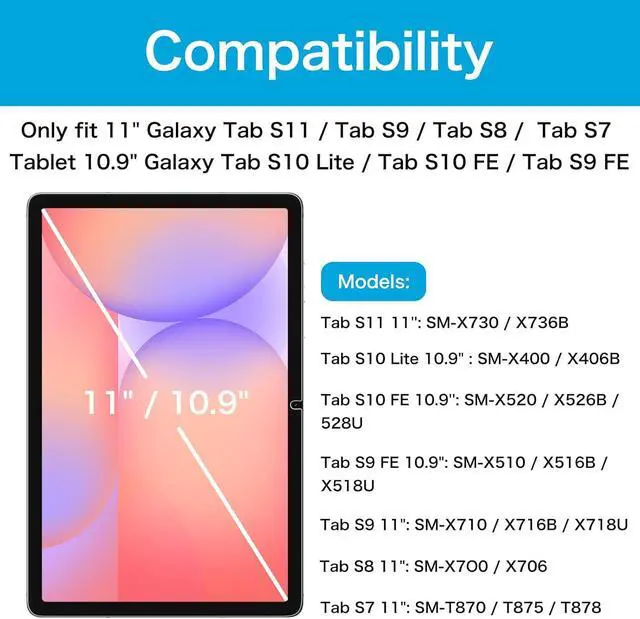 Perfect Compatibility: Exclusively designed for Samsung Galaxy Tab S11 5G 11 inch (Model SM-X730/ X736B) 2025 Release, Samsung Galaxy Tab S10 Lite 5G 10.9 inch (Model SM-X400/X406B) 2025 Release, Samsung Galaxy Tab S10 FE 5G 10.9'' tablet 2025 release (Model SM-X520/ X526B/ X528U); Tab S9 FE 5G 10.9" tablet 2023 release (Model: SM-X510/ X516B/ X518U); Tab S9 11" 2023 release (SM-X710/ X716B/ X718U); Tab S8 11" 2022 release (SM-X700/ X706) and Tab S7 11" 2020 release (SM-T870/ T875/ T878) ONLY. Please kindly check the model number SM-X*** / SM-T*** at the Setting of the tablet before purchase