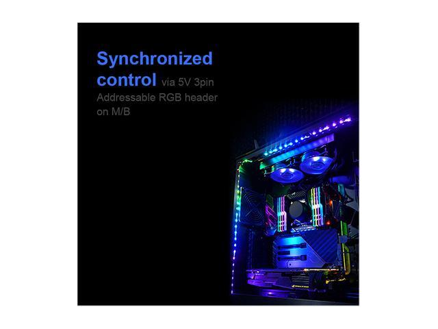 - Synchronised control via 5V Addressable RGB header on M/B. : Can be easily controlled by 5V ADD-RGB Header on M/B (3pin), no additional controller needed, and can synchronize with other ADD-RGB devices. (Only 5V RGB addressable lighting headers from compatible motherboards are supported; please do not connect the strip to a 12V connector)
