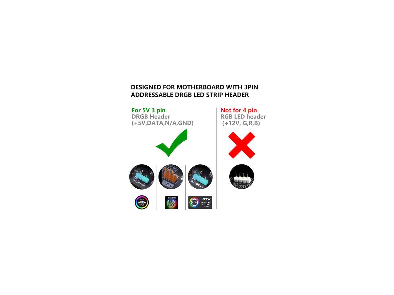 - DESIGNED FOR MOTHERBOARD WITH 3PIN DRGB LED STRIP HEADER : Compatible with ASUS AURA SYNC (5V 3pin) / MSI Mystic Light Sync (5V 3pin) / ASROCK AURA RGB (5V 3pin)/ GIGABYTE RGB Fusion(5V 3pin), Motherboards with 3 pin DRGB Header (+5V,DATA,N/A,GND), not for 4pin RGB LED header (+12V, G,R,B).