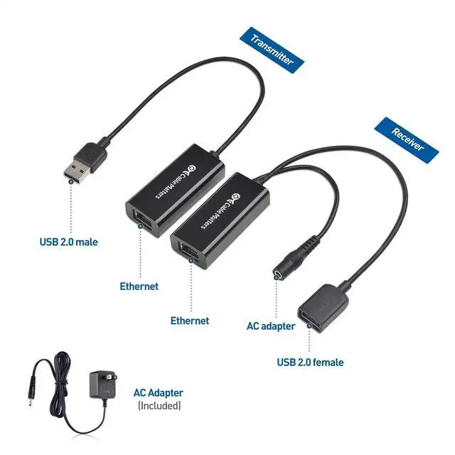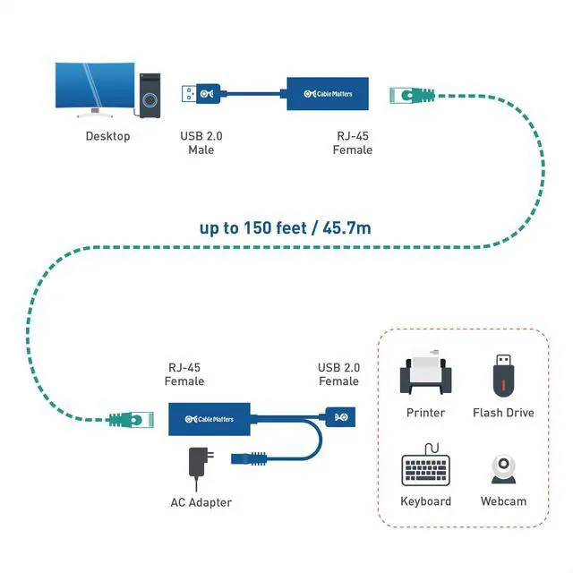 The Cable Matters USB Over Ethernet Extender boosts the length limits of USB connectivity. Connect USB 2.0 devices at distances of up to 150 feet by carrying the data across a high-quality Cat6 Ethernet cable.
