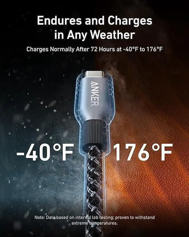 Fast, Reliable, Sustainable: Experience ultra-fast 240W charging with a sustainable cable made from post-consumer recycled nylon, providing quick data transfer and durability in extreme temperatures ranging from -40°F to 176°F.
