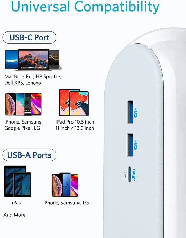 The 45W USB-C port lets you reduce charging times by up to 1.5 hours when charging iPhone 11, iPad Pro 12.9″ (2018), Samsung S10+, and many more devices.