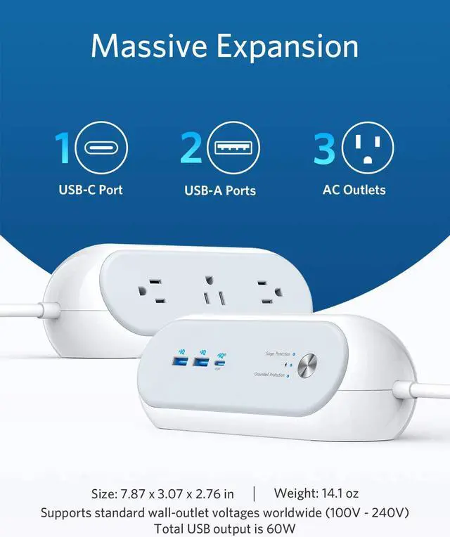 With 3 AC outlets on one side and 2 USB-A ports plus a USB-C port on the other, you can power up to 6 devices simultaneously while also avoiding the mess of tangled cables that typically comes with classic power strips.