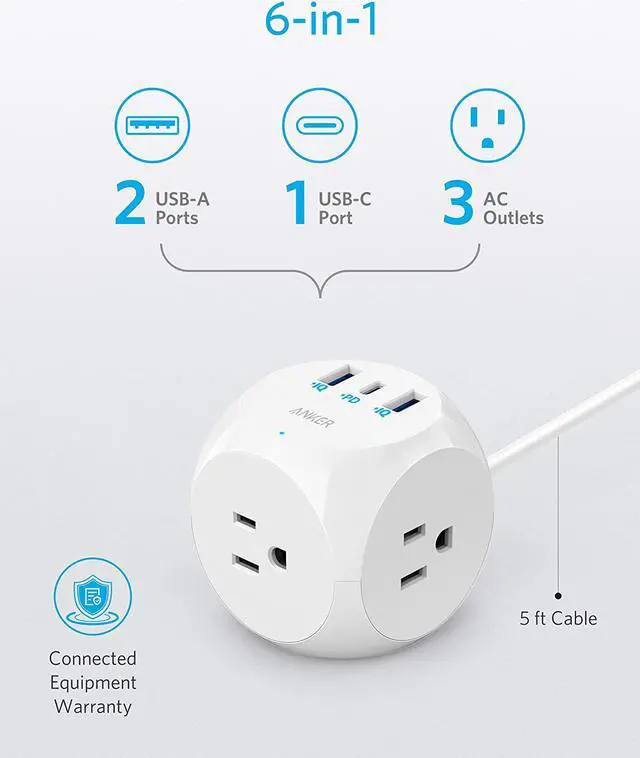 The ultra-compact design packs in 3 AC outlets together with dual 12W USB-A ports and a 30W USB-C port, allowing you to charge and power up to 6 devices simultaneously. Note: The USB-A and USB-C ports share a combined 30W total output.