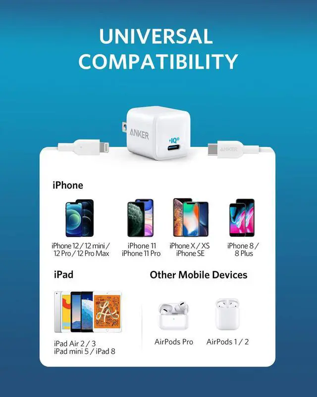 Measuring just over 1 inch on each side and weighing about the same as a AA battery, this is a high-speed charger with unrivaled power and portability.One for AllAnker Nano comes with a USB-C to Lightning cable to work flawlessly with a wide range of Lightning devices including iPhone 12, iPhone 11, iPad mini 5, and more.
