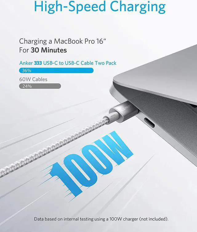 With a max output of 100W, this cable can charge anything from phones to laptops. Pair with a 100W USB-C Power Delivery charger to power up a MacBook Pro 16" in just 2 hours.
