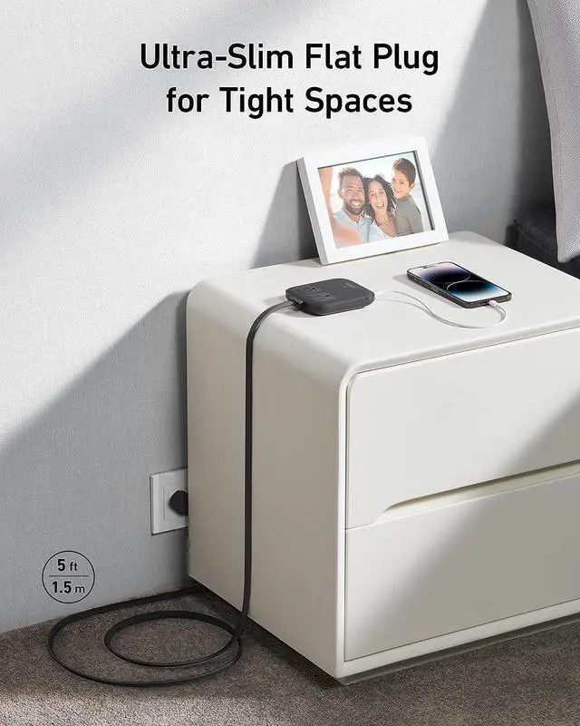 Flexible and Space-Saving: The ultra-slim power strip features a flat AC plug and a soft, flat extension cord, maximizing space efficiency in your home or workspace.