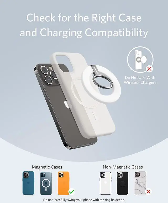 - Do not forcefully swing your phone with the ring holder on as Anker is not responsible for damage from misuse of products, including but not limited to falls or intense movement.